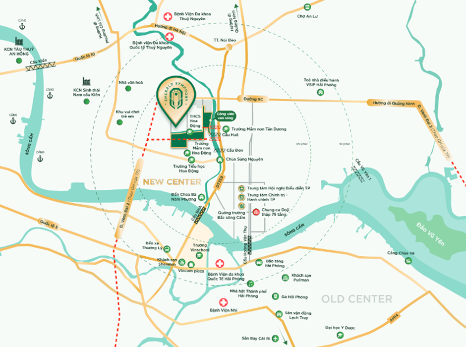 Tọa lạc tại khu vực phát triển năng động bậc nhất của Hải Phòng, Emerald Symphony chỉ cách trung tâm hành chính mới Thủy Nguyên 5 phút di chuyển, đồng thời được bao quanh bởi sông nước và không gian xanh rộng mở, mang đến sự cân bằng và môi trường sống riêng tư, an lành hiếm có giữa nhịp sống đô thị hiện đại.